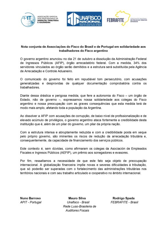 Solidariedade com os colegas da Administração Tributária da Argentina, alvo de uma perigosa e insustentada decisão do Presidente que levou à …